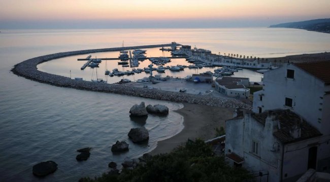 Porto al tramonto con barche ormeggiate e scogli.