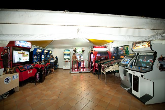 Interno di una sala giochi con diverse macchine arcade e giochi elettronici.