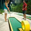 Due persone giocano a minigolf su un percorso illuminato di notte.