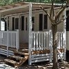 Una casa mobile con terrazza e sedie, immersa tra alberi e ghiaia.